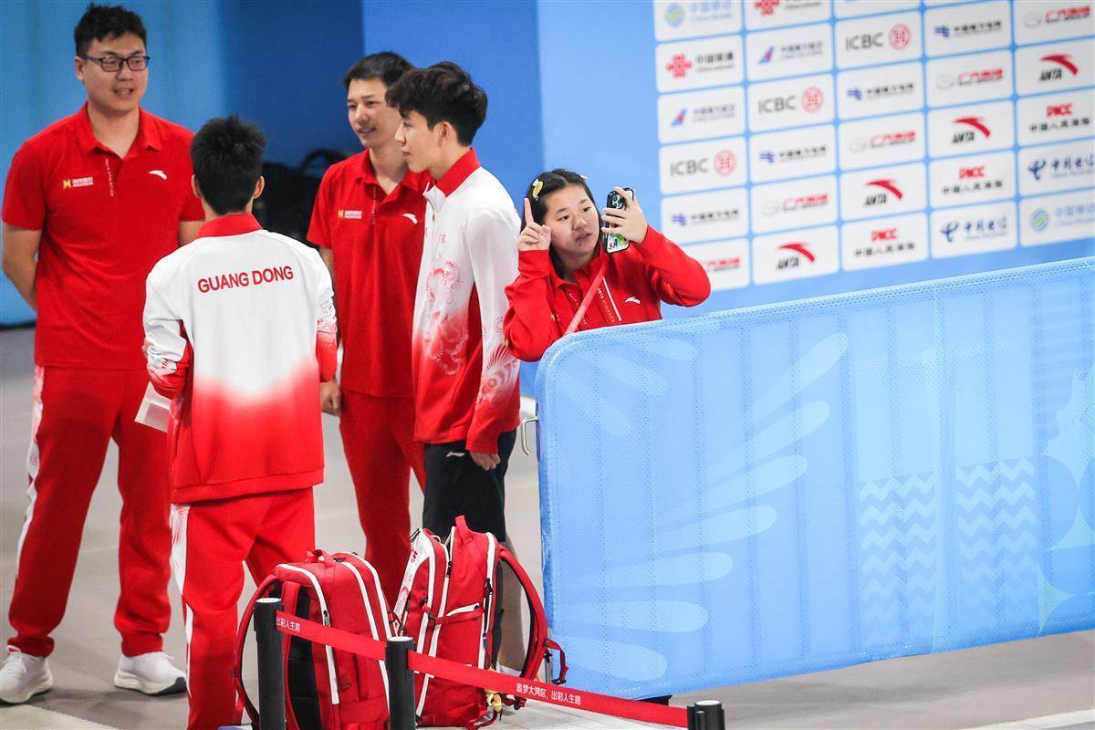 11月3日,当日没有比赛任务的全红婵来到广东奥体中心游泳馆,准备为晚上出战的广东男团加油。在场内,她再度化身“开心果”,吃着零食、拍照、与队友互动,开开心心再启“团宠”模式。(湖北日报全媒记者 时龚 摄)